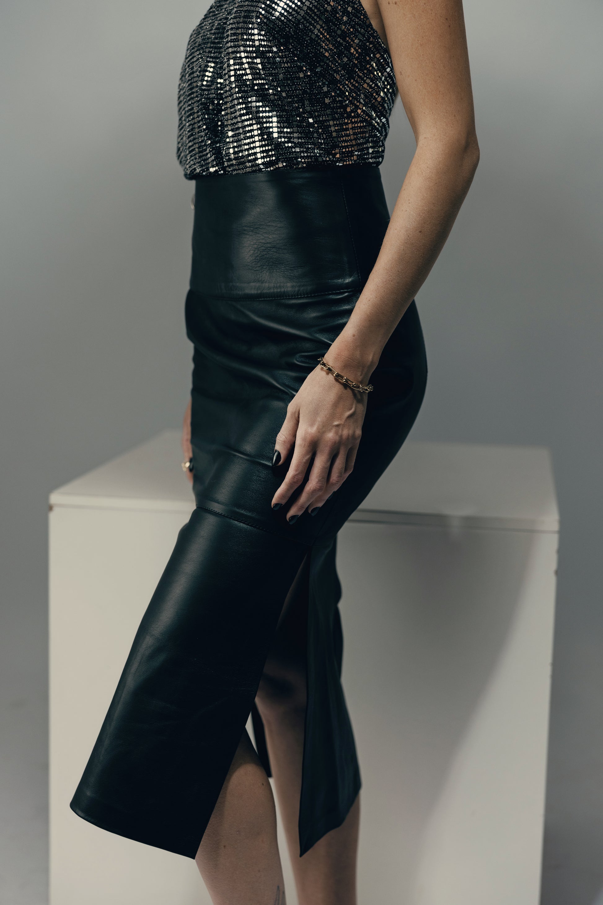Saia cintura alta, justa, com abertura nas laterais abaixo do quadril.