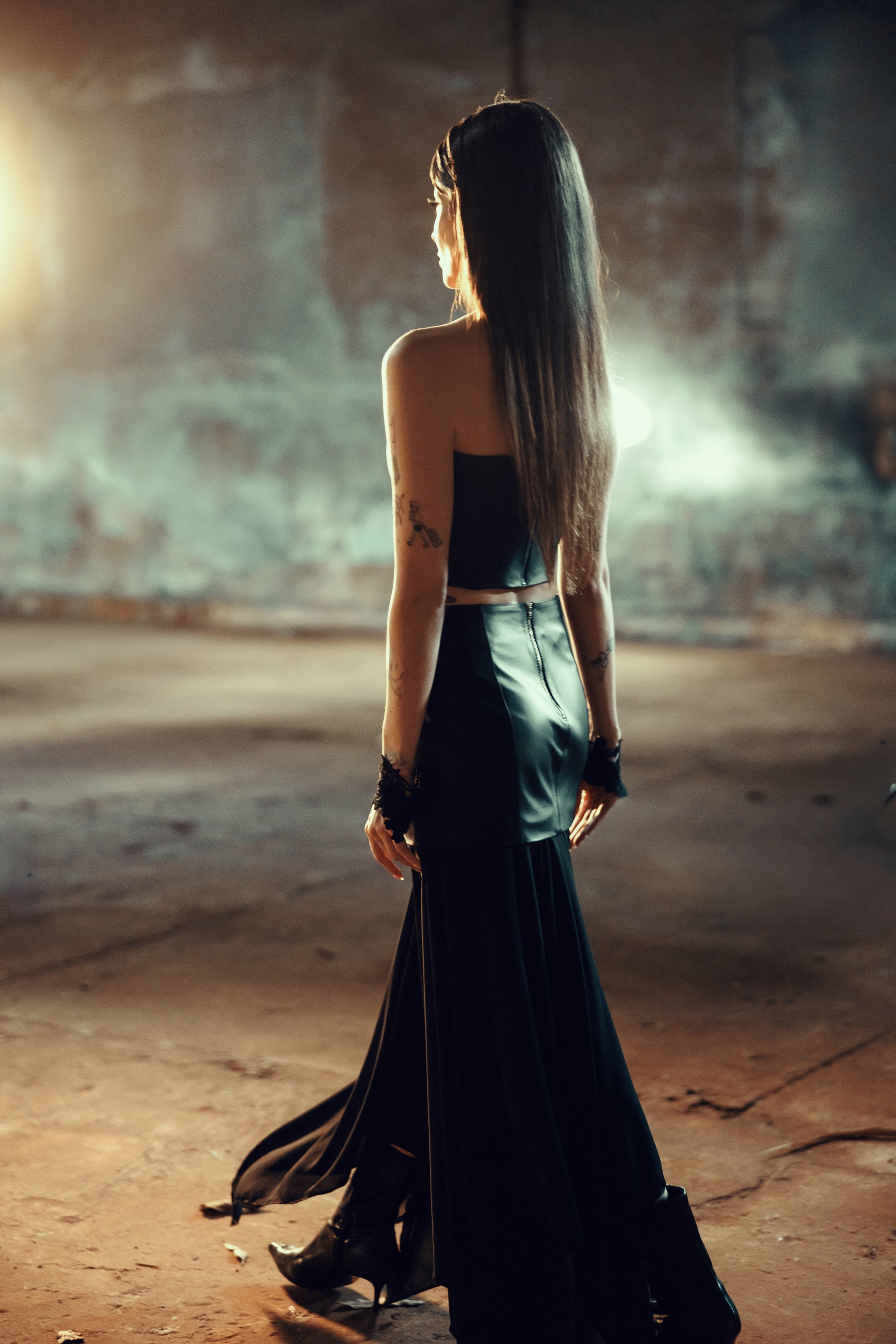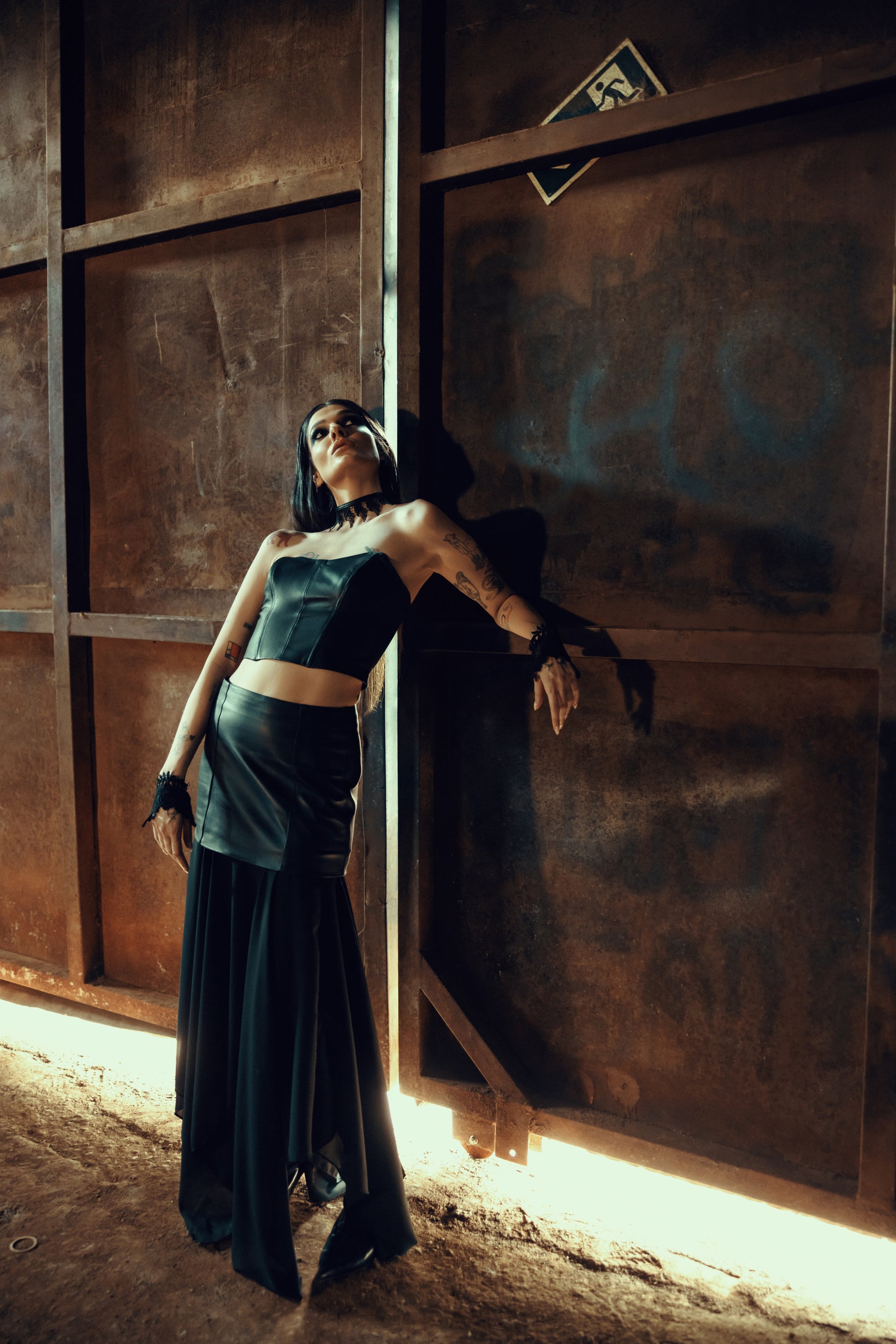 Saia em couro caprino genuíno, com pontas em tecido musseline.